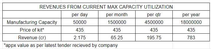 The company had mentioned in an earlier update that they had increased their kit manufacturing capacity to 50000 units per day. This would mean that an order for 1400000 kits for Rs. 60.99 crores could be completed in one month. Obviously, we will have to wait and see if that capacity utilization is maxed out or not in the coming days. If fulfilled in time, the company would be looking at great upside to their kit manufacturing segment in the next 3 quarters.